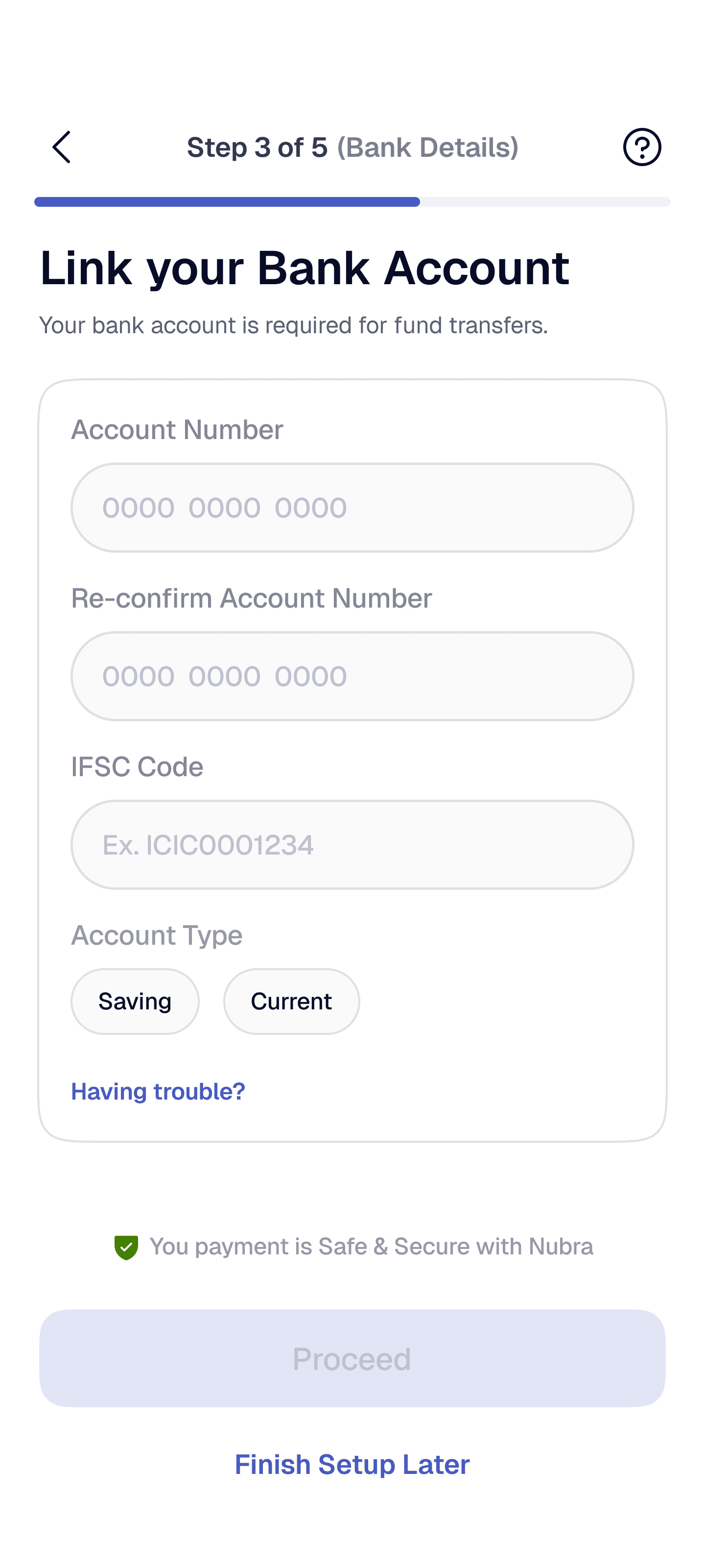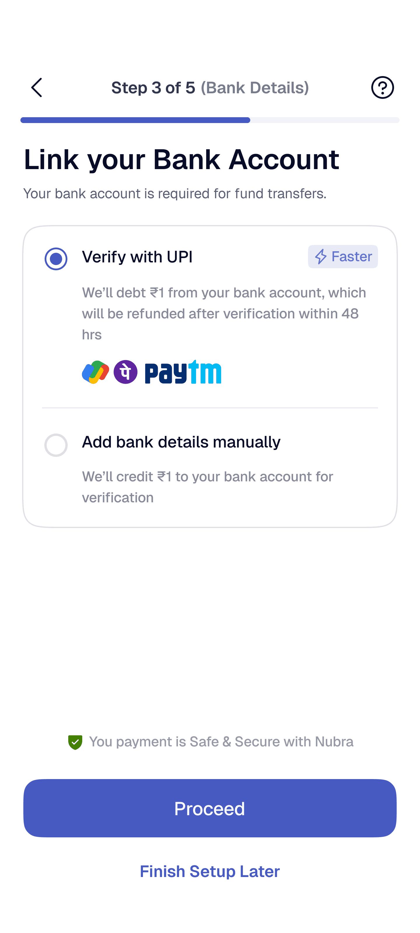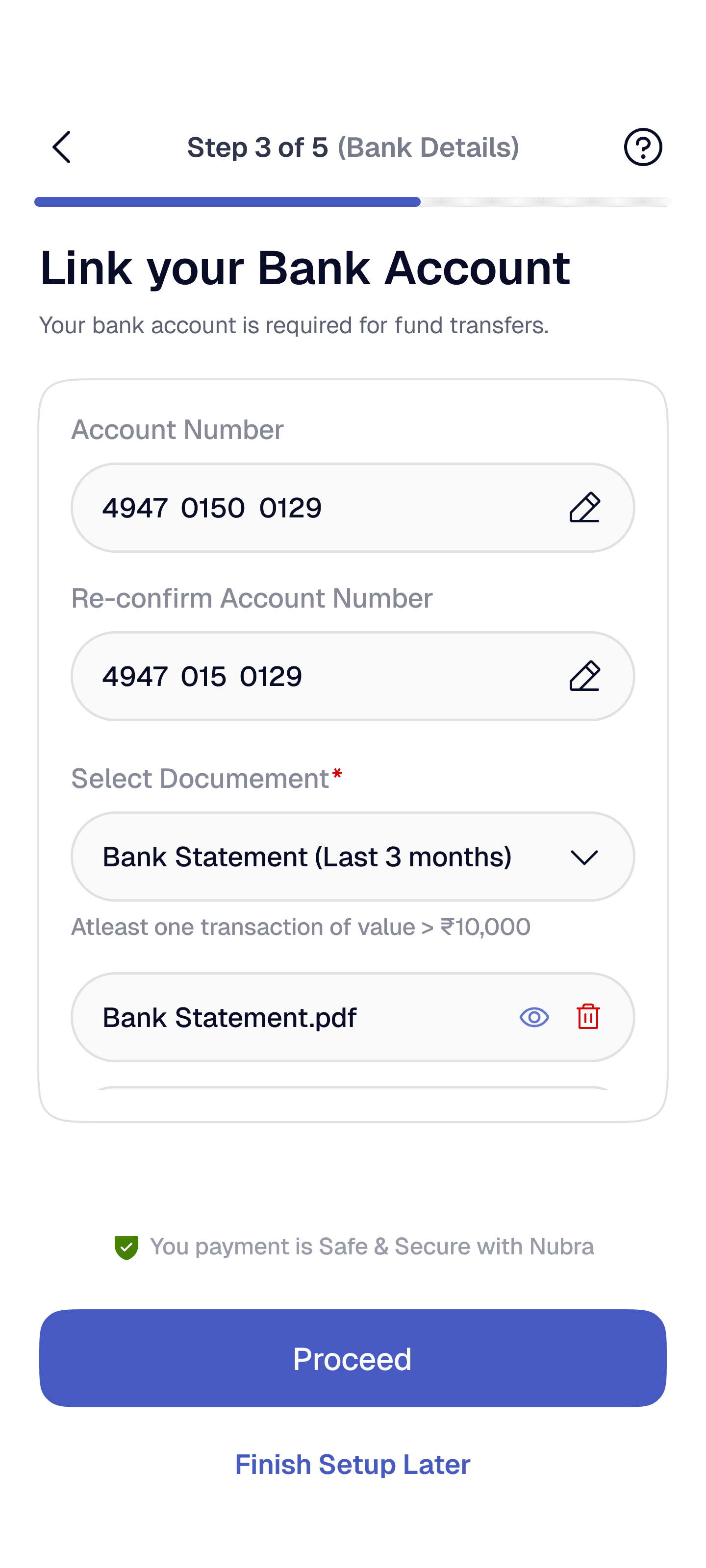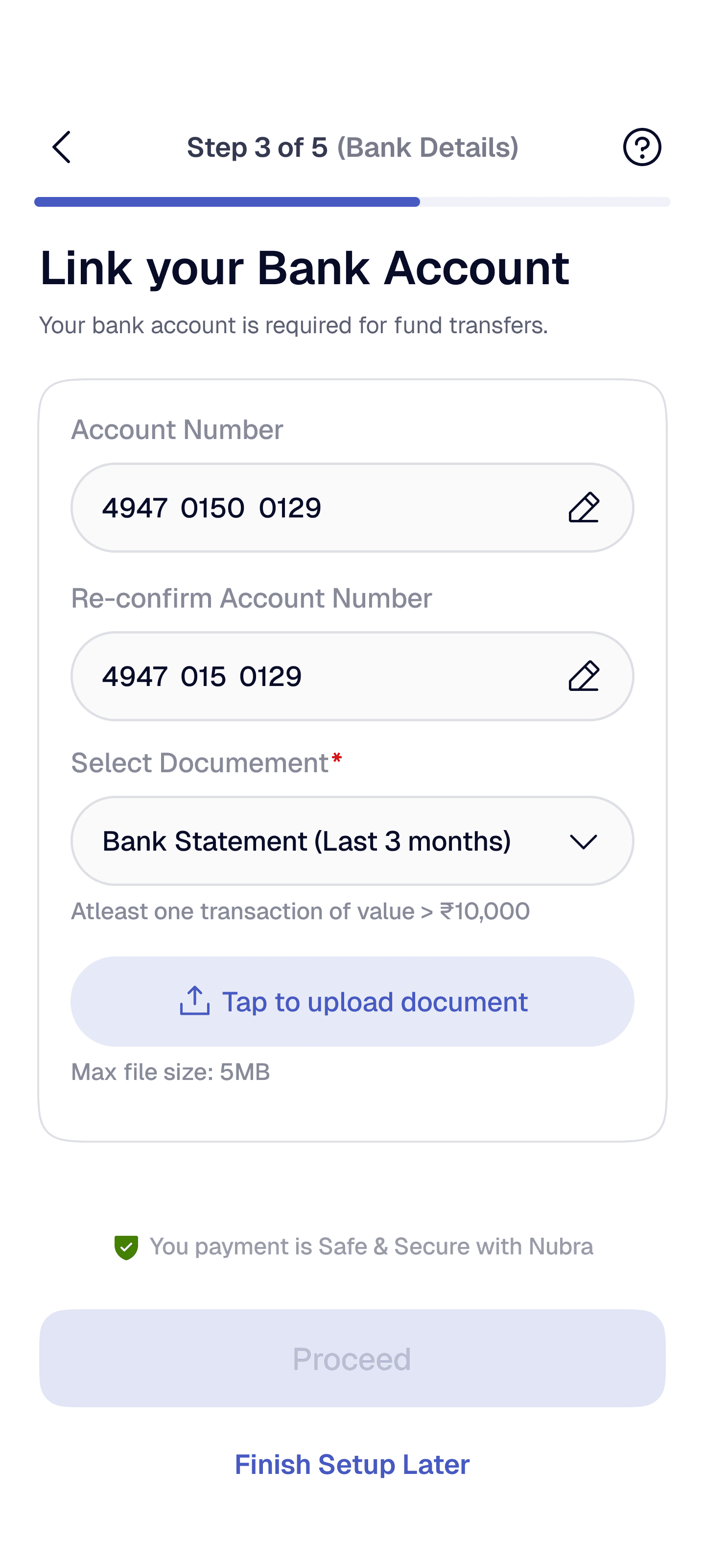 Split KYC into short, goal-oriented steps (e.g., Identity → Bank → Verification) with a visible progress bar or stepper and time estimates.